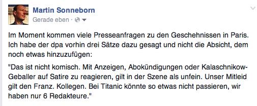 +++ Nach einem Anschlag auf das französische Satiremagazin Charlie Hebdo reagiert die TITANIC-Redaktion mit Solidarität ("Au weia!") und Standfestigkeit ("Wir machen weiter Witze – gleich nach der Mittagspause!") +++ UPDATE: Erste Versehrte sind zu beklagen, Kopfschmerzen nach lästigen Anrufen ("Hallo, Gamperl vom Tittlinger Wochenblatt, hätten Sie ein Statement für uns?") und dem Lesen von Facebook-Kommentaren ("Ihr Feiglinge Warum habt ihr euch Nicht erschiessen lassen?? Seit wohl zu feig dazu was?") +++ UPDATE: Langsam verfestigt sich redaktionsintern die Meinung, daß Mord "eher nicht so gut" wäre, Anschläge auf Satiremagazine "unangenehm". +++ TERRORHINWEIS: Für 16 Uhr ist in der TITANIC-Redaktion eine Pressekonferenz angesetzt, bei der RTL, Hessischer Rundfunk, Frankfurter Rundschau und sämtliche weitere Privat- und Systemmedien anwesend sind. Für Terroristen bietet sich hier die Möglichkeit, nicht nur eine Satireredaktion auszulöschen, sondern auch die gesamte deutsche Lügenpresse. Es gibt Schnittchen (hinterher)!